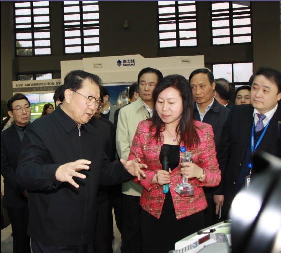 首長(zhǎng)一行緩步走進(jìn)新大陸漂亮的產(chǎn)品展示廳。胡鋼董事長(zhǎng)和王晶總裁向首長(zhǎng)介紹道,新大陸已經(jīng)形成以物聯(lián)網(wǎng)、三網(wǎng)融合通信、綠色環(huán)保科技為三大支柱產(chǎn)業(yè)的整體產(chǎn)業(yè)格局。新大陸綠色環(huán)保產(chǎn)業(yè)主要是由三大塊組成:一是紫外消毒技術(shù);二是大型臭氧技術(shù);三是光化學(xué)除臭。紫外消毒主要用于污水處理,新大陸紫外在市政污水消毒市場(chǎng)占有率在國(guó)內(nèi)始終是第一;紫外技術(shù)還可用于江湖或景觀除藻,新大陸的大型臭氧技術(shù)填補(bǔ)了國(guó)內(nèi)的空白,也打破了國(guó)內(nèi)大型臭氧產(chǎn)品百分九十九以上為國(guó)外產(chǎn)品壟斷的局面,在國(guó)內(nèi)自來水深度處理上發(fā)揮重要作用。在新大陸環(huán)保公司自制的紫外消毒的飲水車旁,王晶總裁向首長(zhǎng)介紹了2008年汶川地震期間,新大陸員工風(fēng)雨兼程將飲水車開到汶川災(zāi)區(qū),為災(zāi)區(qū)人民送去清潔干凈飲用水,深受災(zāi)區(qū)人民喜愛的感人事跡。