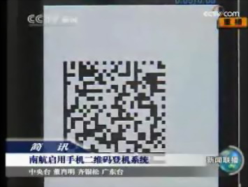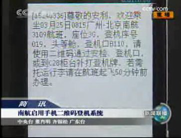 又訊:CCTV4月8日晚間新聞:全國(guó)首條手機(jī)二維碼航線(xiàn)啟用 旅客憑手機(jī)彩信可直接辦理登機(jī)