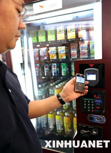 昨日,在臺北國際電腦展上,工作人員展示新大陸科技集團(tuán)研發(fā)的自動識別系統(tǒng),消費者不用投幣,通過手機(jī)就能買飲料。