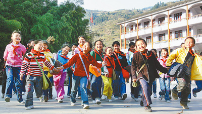 切實保障所有孩子都有學上。圖為貴州雷山縣苗家孩子高興地上學。